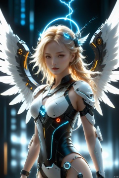 cyberpunk art,fantasy art,1girl,angel,angel wings,white theme,(winding lightning:1.2),mechanically constructed body,extremely complex mechanical structures,white skin,white wings,bright picture,red eyes,electricity,breasts,realistic,looking at viewer,blonde hair,mechanical wings,red eyes,a glowing halo above one's head,masterpiece,best quality,ultra-detailed,very detailed illustrations,extremely detailed,intricate details,highres,super complex details,extremely detailed 8k cg wallpaper,cowboy shot,reflections,ray tracing,dark aura,cyber effect,mecha girl parts,robot joints,single mechanical arm,(angel's halo),mechanical halo,intricate mechanical bodysuit,mecha corset,(transparent plastic armor),very long hair,hair between eyes,multicolored hair,colored inner hair,random expressions,random action,dynamic pose.true-to-life feathers,This female character possesses a body constructed entirely of intricate mechanical components,the complexity and finesse of which are truly awe-inspiring. Her skin is flawlessly white,and she unfurls a pair of pure white wings behind her back,adorned with a winding lightning pattern that is rendered at 1.2 times the standard density,creating a striking visual impact. These wings not only embody mechanical architecture but are also depicted with such lifelike detail that they resemble genuine feathers.,She boasts ruby-red eyes that gleam with the kinetic energy of flowing electricity,directly engaging the viewer. Her golden locks shine brightly as they flow in the wind,with several strands naturally cascading down between her eyes. She sports a single mechanical arm,its joints meticulously designed with a distinct cyberpunk aesthetic.,Her head is adorned with a halo composed of similar mechanical parts,softly emitting light,further enhancing her portrayal as a mechanical angel., scenery<lora:EMS-349481-EMS:0.800000>, <lora:EMS-337923-EMS:0.600000>, <lora:EMS-317135-EMS:0.600000>