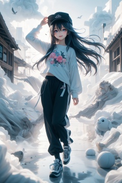 .,(loli:1.5),(5yo:1.5),(very_long_hair,:1.3),(masterpiece),(best quality),artist GiO,1girl,long hair,solo,hat,long sleeves,baseball cap,bird,smile,blue eyes,sky,shoes,closed mouth,black headwear,outdoors,bangs,white footwear,very long hair,shirt,sleeves past wrists,feathers,black pants,cloud,looking at viewer,hand on headwear,arm up,full body,blue hair,hair between eyes,white shirt,blush,standing,pants,layered sleeves,clothes writing,sneakers,short over long sleeves,cloudy sky,