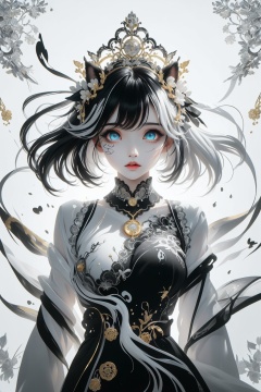 masterpiece,(best quality),Amazing,beautiful detailed eyes,((((1girl)))),finely detailed, Depth of field,extremely detailed CG unity 8k wallpaper,(((cute animal face))),(((a girl wears Clothes Black and white Taoist robes))),((Extremely gorgeous magic style)), ((((gold and silver lace)))),(((flowing lace))),(((flowing ((black)) and white background))),(((((gorgeous detailed eyes))))),(((((((gorgeous detail face))))))),((floating hair)),(((Pick and dye black hair in white hair))),(((flowing transparent black))),(((flowing transparent white))),(((((ink))))),((((small breast)))),(((extremely detailed gorgeous tiara))), (((white hair))),((black hair stick)),((white hair ornament)),((gold gorgeous necklace)), ((flowing hair)),(((The picture fills the canvas))),((The character is in the center of the frame)),(((flowing))),((bright pupils)),((((melt)))),(((((black and white melt)))))