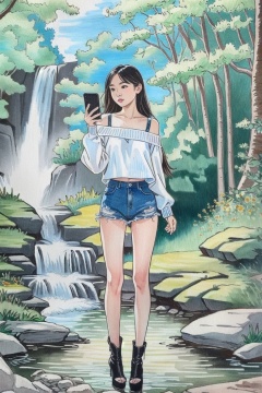 ((HRD, HUD, 8K)),((masterpiece, best quality)), highly detailed, soft light,ColoredLead, 1girl, solo, off-shoulder sweater, denim shorts, high heels, phone, cellphone, long hair, holding phone, smartphone, holding, standing, full body, chinese text, traditional media, fine art parody, parody, Landscape, river and waterfall, <lora:画风-彩铅-ColoredLead_v1.0:0.8>