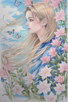 ((HRD, HUD, 8K)),((masterpiece, best quality)), highly detailed, soft light,ColoredLead, 1girl, flower, bug, butterfly, solo, long hair, traditional media, blonde hair, water, parted lips, profile, painting (medium), pink flower, lips, <lora:画风-彩铅-ColoredLead_v1.0:0.8>
