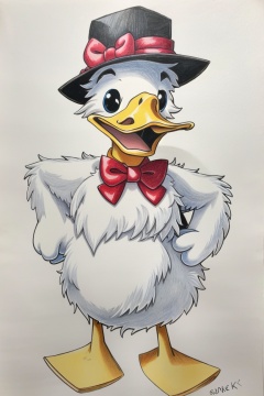 ((HRD, HUD, 8K)),((masterpiece, best quality)), highly detailed, soft light,ColoredLead, duck, hat, bird, solo, bow, bowtie, traditional media, 1boy, open mouth, male focus, simple background, artist name, white background, signature, smile, hands on hips, cosplay, <lora:画风-彩铅-ColoredLead_v1.0:0.8>