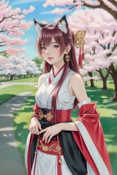 ((HRD, HUD, 8K)),((masterpiece, best quality)), highly detailed, soft light,ColoredLead, 1girl, solo, yae miko, pink hair, purple eyes, long hair, detached sleeves, japanese clothes, animal ears, looking at viewer, fox ears, breasts, branch, hair between eyes, jewelry, wide sleeves, earrings, bangs, bare shoulders, cherry blossoms, nontraditional miko, sketch, medium breasts, tree, hair ornament, , <lora:画风-彩铅-ColoredLead_v1.0:0.8>