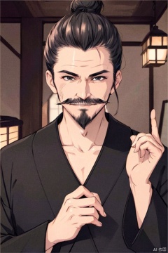 solo,highly detailed,(best quality),((masterpiece)),jx,1boy,facial hair,male focus,solo,beard,mustache,upper body,,black eyes,black hair,single hair bun,japanese clothes,long sleeves,old man,short hair,((evil smile)),(((old))),
