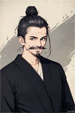 solo,highly detailed,(best quality),((masterpiece)),jx,1boy,facial hair,male focus,solo,beard,mustache,upper body,,black eyes,black hair,single hair bun,japanese clothes,long sleeves,old man,short hair,((evil smile)),(((old))),(arms behind back),portrait,