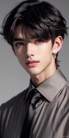 solo, looking at viewer, short hair, bangs, shirt, black hair, 1boy, hair between eyes, jewelry, closed mouth, jacket, upper body, grey hair, male focus, multicolored hair, earrings, necktie, collared shirt, gradient, grey eyes, petals, black shirt, gradient background, eyelashes, formal, black background, gem, portrait, light particles, glint
