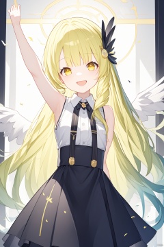 (best quality),(masterpiece),1girl, solo, long_hair, dress, smile, very_long_hair, open_mouth, breasts, bird, looking_at_viewer, sleeveless, outstretched_arm, hair_ornament, yellow_eyes, arm_up, wings, hand_on_own_chest