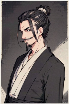 solo,highly detailed,(best quality),((masterpiece)),jx,1boy,facial hair,male focus,solo,beard,mustache,upper body,,black eyes,black hair,single hair bun,japanese clothes,long sleeves,old man,short hair,((evil smile)),(((old))),(arms behind back),portrait,(long beard),