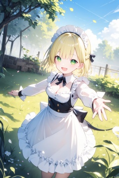 (best quality),(masterpiece),1girl, animal ears, breasts, solo, green eyes, cleavage, blonde hair, open mouth, maid, tail, maid headdress, smile, wrist cuffs, looking at viewer, braid, apron, grass, medium breasts, outstretched arms, fang, petals, short hair, outdoors, ribbon, :d, frills