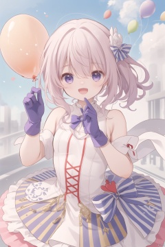 sa-fu \(sfmk39\), (best quality),(masterpiece),1girl, solo, gloves, one eye closed, purple gloves, elbow gloves, dress, bow, smile, v, ;d, open mouth, bare shoulders, hair between eyes, looking at viewer, balloon, ferris wheel, striped bow, small breasts, striped
