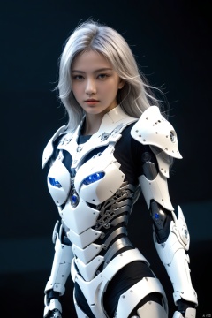 hubg\(mecha_girl)\, (ultra realistic,best quality),photorealistic,Extremely Realistic, in depth, cinematic light,hubgwomen,hubg_beauty_girl, front_view, masterpiece, best quality, photorealistic, raw photo, (1girl, looking at viewer), long white hair, mechanical white armor, intricate armor, delicate blue filigree, intricate filigree, red metalic parts, detailed part, dynamic pose, detailed background, dynamic lighting, HUBG_Mecha_Armor, intricate background, realism,realistic,raw,analog,portrait,photorealistic,