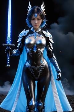 fantasy art, blue flame, full moon, samurai sword,