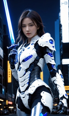 one girl wearing white sci-fi body armor, holding a glowing blue sword downwards in front of her body, dynamic poses, dark blue background, highly detailed, ultra-high resolutions, 32K UHD, best quality, masterpiece,