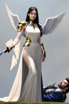 A beautiful and gentle girl with a long golden sword fought with a man,The man was scarred with blood, and the girl wore a white gauze skirt,Her gauze dress was not stained with blood,pThere was no blood on her body. She had long black hair.,