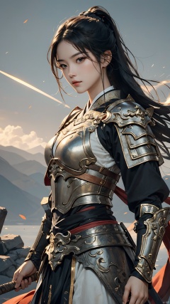 masterpiece,best quality,1girl, beautiful chinese girl, (beautiful detailed armor), (beautiful detailed hanfu), black eyes,(see-through),