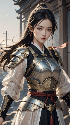 masterpiece,best quality,1girl, beautiful chinese girl, (beautiful detailed armor), (beautiful detailed hanfu), black eyes,(see-through),