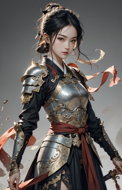 masterpiece,best quality,1girl, beautiful chinese girl, (beautiful detailed armor), (beautiful detailed hanfu), black eyes,(see-through),