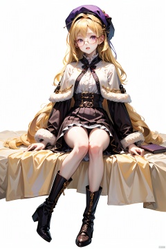 best quality,1girl,glasses,hat,solo,full body,looking at viewer,white background,chain,long hair,purple eyes,book,thighhighs,wavy hair,beret,simple background,frills,brown hair,dress,magic,capelet,boots,white thighhighs,ribbon,skirt,fur trim,blonde hair,cuffs,floating,red headwear,,