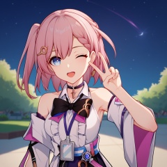 absurdres, best quality, uncensored, score_9, score_8_up, score_7_up, outdoors, night sky, starry sky, solo, 1girl, asta \(honkai: star rail\), hairclip, one side up, pink hair, braid, blue eyes, black bowtie, white shirt, black skirt, bare shoulders, detached sleeves, id card, center frills, lanyard, choker,upper body,one eye closed,open mouth,v, looking at viewer, <lora:asta-000004:0.8>,