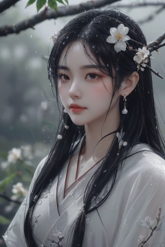 (\yan yu\),rainning,1girl, solo, jewelry, long hair, earrings, hair ornament, black hair, branch, flower, upper body, blurry background, chinese clothes, dress, hair flower, black eyes, closed mouth, realistic