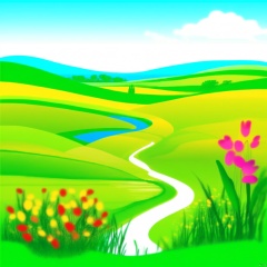 Bright colors, cheerful atmosphere, natural elements, lightness, simple lines, rural landscape, harmonious composition, fresh feeling, vitality, green plants, nature, comfortable mood, vitality, happy life, leisure time, wild flowers and beautiful countryside.