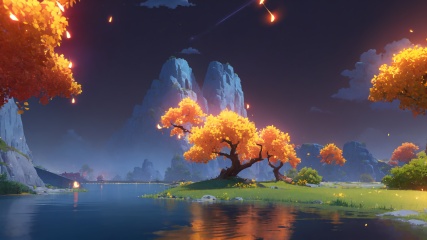 extremely detailed CG unity 8k wallpaper,masterpiece,best quality,ultra-detailed,best shadow,High contrast,best illumination,an extremely delicate and beautiful,dynamic angle,cityscape horizon,mountainous horizon,depth of field,in summer,(night:1.2),(fireflies:1.3),hyper_galaxy,shooting star,cloud,floating,tree,water,beautiful and delicate water,reflection,<lora:liyue-000015:0.9>,