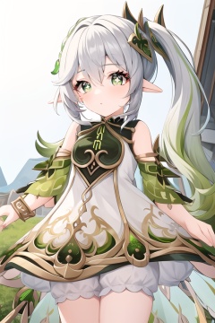 (masterpiece, best quality:1.2),insanely detailed,absurdres,ultra-highres,ultra-detailed,best quality,slender,kawaii,perfect symmetrical face,ultra cute girl,ultra cute face,ultra detailed eyes,ultra cute,ultra beautifu,toeless legwear,nahida \(genshin impact\),1girl,solo,loli,symbol-shaped pupils,1girl,solo,loli,white dress,bare shoulders,side ponytail,hair ornament,jewelry,bracelet,detached sleeves,sleeveless dress,bloomers,<lora:nahida-000008:1>,+_+,adjusting hair,outdoors,standing,