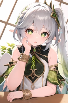 (masterpiece, best quality:1.2),insanely detailed,absurdres,ultra-highres,ultra-detailed,best quality,slender,kawaii,perfect symmetrical face,ultra cute girl,ultra cute face,ultra detailed eyes,ultra cute,ultra beautifu,toeless legwear,nahida \(genshin impact\),1girl,solo,loli,(symbol-shaped pupils),1girl,solo,loli,white dress,bare shoulders,side ponytail,hair ornament,jewelry,bracelet,detached sleeves,sleeveless dress,bloomers,bare legs,toeless legwear,short socks,<lora:nahida-000008:1>,+_+,open mouth,ndoors,sitting,hand on own cheek,table,