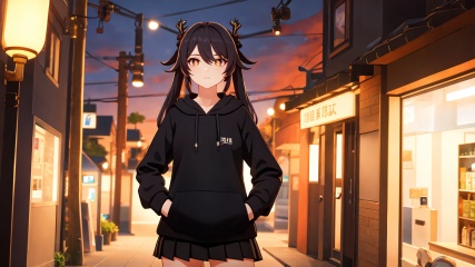 masterpiece,best quality,cinematic light,dramatic light,best shadow,colorful,wallpaper,high contrast,best illumination,ultra-detailed,an extremely delicate and beautiful,dynamic angle,depth of field,cowboy shot,upper body,(solo:1.5),1girl,(hoodie:1.5),(pleated skirt:1.5),(black shirt:1.5),perfect face,perfect eyes,sidelighting,outdoors,street,phone booth,cityscape,shop,handrail,street lamp,power lines,hands in pockets,sidelocks,detailed background,perfect hands,perfect fingers,detailed fingers,<lora:hutao-000010:0.5>,hu tao (genshin impact),symbol-shaped pupils,twintails,
