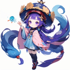 (masterpiece, best quality,top quality),[(white background:1.2)::5],(wide shot:0.95),Dynamic angle,(full body),<lora:GI_CVP-v15:1>,gicvp,1girl,loli,toddler,loli's body type,liyue,cryo,solo,beads,jewelry,hat,thighhighs,bead necklace,qing guanmao,hair ornament,purple hair,necklace,braid,jiangshi,white thighhighs,looking at viewer,long sleeves,long hair,ofuda,purple eyes,coin hair ornament,wide sleeves,bangs,shorts,braided ponytail,bandages,bandaged leg,earrings,standing,purple headwear,single braid,vision,dress,pink eyes,chinese clothes,zettai ryouiki,cape,yin yang,chibi,depth_of_field,particle effects,