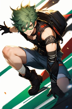 (masterpiece, best quality,top quality),[(white background:1.2)::5],(wide shot:0.95),Dynamic angle,(full body),<lora:GI_CVP-v15:1>,gicvp,1boy,(teenager),boy's body type,mondstadt,pyro,solo,goggles,weapon,green eyes,shorts,gloves,sword,boots,goggles on head,holding weapon,holding sword,holding,open mouth,sleeveless,bandaid,white hair,blue shorts,hair between eyes,smile,bandaid on face,bandaid on nose,belt,black footwear,brown gloves,looking at viewer,sleeveless shirt,depth_of_field,particle effects,