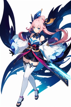 (masterpiece, best quality,top quality),[(white background:1.2)::5],(wide shot:0.95),Dynamic angle,(full body),<lora:GI_CVP-v15:1>,gicvp,girl's body type,1girl,inazuma,hydro,solo,bow-shaped hair,thighhighs,gloves,pink hair,long hair,vision,wide sleeves,bangs,white gloves,purple eyes,multicolored hair,blunt bangs,bow,smile,frilled sleeves,shorts,half gloves,frills,bare shoulders,hair ornament,looking at viewer,white thighhighs,sandals,long sleeves,detached sleeves,gradient hair,blue eyes,blue hair,bowtie,short shorts,sidelocks,depth_of_field,particle effects,