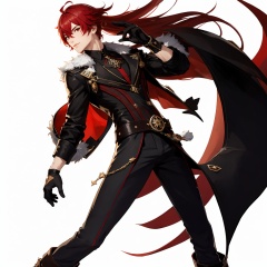 (masterpiece, best quality,top quality),[(white background:1.2)::5],(wide shot:0.95),Dynamic angle,(full body),<lora:GI_CVP-v15:1>,gicvp,diluc \(genshin impact\),1boy,male's body type,mondstadt,pyro,long hair,red hair,solo,simple background,gloves,vision,red eyes,black pants,bangs,pants,boots,ponytail,adjusting gloves,black footwear,long sleeves,jacket,hair between eyes,fur trim,standing,black gloves,coat,closed mouth,belt,adjusting clothes,shirt,black coat,black jacket,looking at viewer,depth_of_field,particle effects,