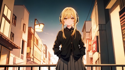 masterpiece,best quality,cinematic light,dramatic light,best shadow,colorful,wallpaper,high contrast,best illumination,ultra-detailed,an extremely delicate and beautiful,dynamic angle,depth of field,cowboy shot,upper body,<lora:lumine:0.6>,(lumine (genshin impact):0.8),(solo:1.3),1girl,hair ornament,yellow eyes,blonde hair,(pleated skirt:1.3),(black shirt:1.3),headphones,perfect face,perfect eyes,sidelighting,outdoors,street,phone booth,cityscape,shop,handrail,street lamp,power lines,hands in pockets,sidelocks,