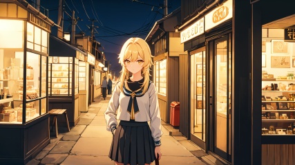 masterpiece,best quality,cinematic light,dramatic light,best shadow,colorful,wallpaper,high contrast,best illumination,ultra-detailed,an extremely delicate and beautiful,dynamic angle,depth of field,cowboy shot,upper body,<lora:lumine:0.6>,lumine (genshin impact),(solo:1.3),1girl,yellow eyes,blonde hair,(pleated skirt:1.3),(black shirt:1.3),perfect face,perfect eyes,sidelighting,outdoors,street,phone booth,cityscape,shop,handrail,street lamp,power lines,hands in pockets,sidelocks,