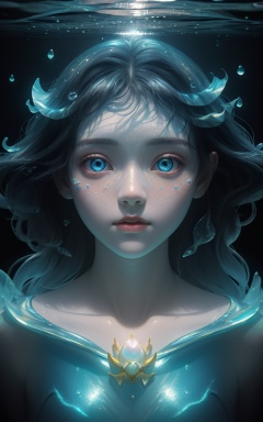 fantasyArt,girl swims underwater,hyper detailed render style,glow,yellow,blue,brush,surreal oil painting,shiny eyes,head closeup,exaggerated perspective,tyndall effect,water drops,mother of pearl iridescence,holographic white,black background,