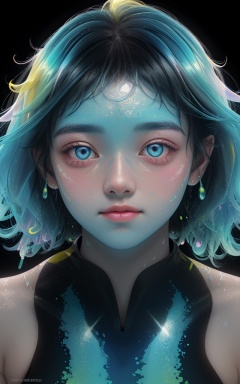 colorful,girl swims underwater,hyper detailed render style,glow,yellow,blue,brush,surreal oil painting,shiny eyes,head closeup,exaggerated perspective,tyndall effect,water drops,mother of pearl iridescence,holographic white,black background,