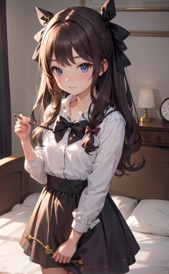 masterpiece,8k,best quality,1girl,solo,((depth of field)),bowknot,long hair,light,room,white ribbon,on bed