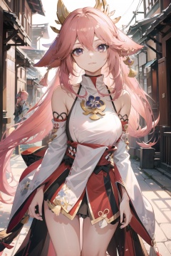(masterpiece, best quality:1.2),insanely detailed,absurdres,ultra-highres,ultra-detailed,best quality,slender,kawaii,perfect symmetrical face,ultra cute girl,ultra cute face,ultra detailed eyes,ultra cute,ultra beautifu,toeless legwear,<lora:Yae Miko-000008:1>,yae miko,1girl,solo,1girl,solo,jewelry,detached sleeves,long hair,japanese clothes,wide sleeves,sandals,earrings,breasts,fox ears,bare legs,bare shoulders,long sleeves,toenail polish,hair ornament,ankle lace-up,neck ruff,backless outfit,nontraditional miko,outdoors,day,standing,