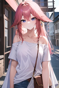 (masterpiece, best quality:1.2),insanely detailed,absurdres,ultra-highres,ultra-detailed,best quality,slender,kawaii,perfect symmetrical face,ultra cute girl,ultra cute face,ultra detailed eyes,ultra cute,ultra beautifu,<lora:Yae Miko-000008:0.8>,yae miko,1girl,solo,smug,hair ornament,earrings,shirt,white shirt,collarbone,short sleeves,t-shirt,off shoulder,oversized shirt,naked shirt,oversized clothes,outdoors,