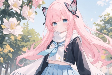 1girl, solo, long hair, looking at viewer, blush, bangs, blue eyes, skirt, shirt, hair accessory, long sleeves, very long hair, closed mouth, school uniform, white shirt, pink hair, flower, , Pleated skirt, sailor collar, sides up, scarf, white flowers, butterflies, fluffy long sleeves, white sailor collar, multicolored eyes, yellow flowers, butterfly hair accessory, blue scarf, yellow skirt, hair accessory