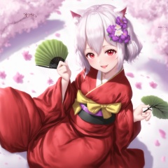 <lora:HAK:1>,cat ears, flowers, white hair, 1girl, solo, looking at viewer, blush, smile, short hair, open mouth, bangs, hair ornament, red eyes, long sleeves, white background, holding, animal ears, hair between eyes, tail, upper body, flower, :d, japanese clothes, fang, hand up, hair flower, kimono, hair bun, blurry, animal ear fluff, petals, single hair bun, white flower, cherry blossoms, hand fan, pink flower, white kimono, folding fan, branch, holding fan, uchikake
