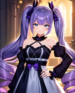 <lora:xiangwan-asoul-a3d:0.6>,ray tracing,very aesthetic,aesthetic,amazing quality,best quality,hight,hight quality,masterpiece,highres BREAKVolumetric Lighting,Cinematic Lighting,background light,moody lighting,dusk,1girl,twintails,solo,smile,blue eyes,purple hair bow,halter dress,black sleeves,long hair,purple hair,bangs,hand on hip,closed mouth,very long hair,breasts,gothic architecture,cowboy_shot,looking_at_viewer,looking_down,
