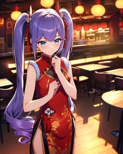 <lora:xiangwan-asoul-a3d:0.6>,ray tracing,very aesthetic,aesthetic,amazing quality,best quality,hight,hight quality,masterpiece,highres BREAKVolumetric Lighting,Cinematic Lighting,background light,moody lighting,dusk,1girl,solo,long hair,purple hair,twintails,blue eyes,red china dress,red hairband,very long hair,smile,china dress,indoors,sleeveless,bangs,standing,restaurant,