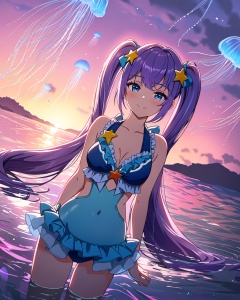 <lora:xiangwan-asoul-a3d:0.6>,ray tracing,very aesthetic,aesthetic,amazing quality,best quality,hight,hight quality,masterpiece,highres BREAKVolumetric Lighting,Cinematic Lighting,background light,moody lighting,dusk,1girl,purple hair,twintails,blue eyes,long hair,star hair ornament,blue one-piece swimsuit,blue hairband,solo,very long hair,frilled swimsuit,breasts,smile,in water,in sea,jellyfish,