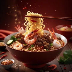 (8k, RAW photo, best quality, masterpiece:1.2),Commercial Photography, instant noodle in bowl and chopstick, topping with prawn and meat. White Lighting, 8k Rendering, High Resolution Photography, Extraordinary Detail, Fine Detail, On Solid Wooden Table, Red Background, 8k, Commercial Photography, Stock Photography, Professional Color Grading::1