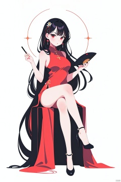 1girl, solo, long hair, looking at viewer, black hair, hair ornament, white background, dress, holding, bare shoulders, sitting, full body, high heels, crossed legs, hand fan, red dress