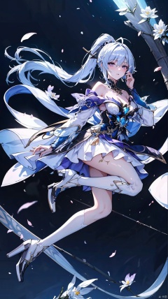 Beautiful Girl, long hair, high ponytail, light purple skirt, white silk slim stockings , collarbone, full body, off shoulder, white dress, high heels, petals, white footwear, antenna hair, hand on own face, off-shoulder dress, yeqinxian, lactation
