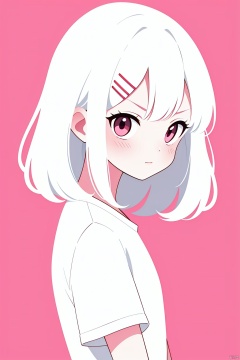 1girl, solo, looking at viewer, blush, bangs, simple background, shirt, hair ornament, red eyes, white shirt, upper body, white hair, short sleeves, hairclip, medium hair, pink eyes, pink background