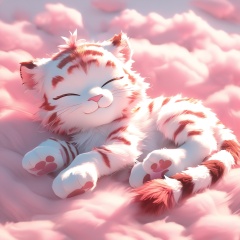 yinhu,tigger,fluffy,pink pattern,soft lighting,tiger boy,white fur,whimsy and dramatic lighting,warm colors,tigger focus,mf-movie-filter,cc-color-correction,cute,whiskers,:3,^ ^,no humans,closed eyes,on back,cloud,pink theme,lying,solo,closed mouth,cloudy sky,full body,smile,sky,red theme,white background,facing viewer,simple background,<lora:yinhu_annimate_xl_p_ith_txt:0.8>,